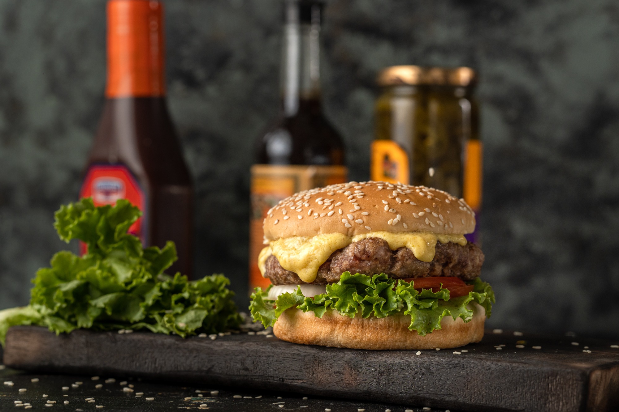 maślana bułka, 200g wołowiny, sałata karbowana, ser cheddar, ogórek konserwowy, pomidor, cebula czerwona, sos autorski majonezowy, ketchup -
